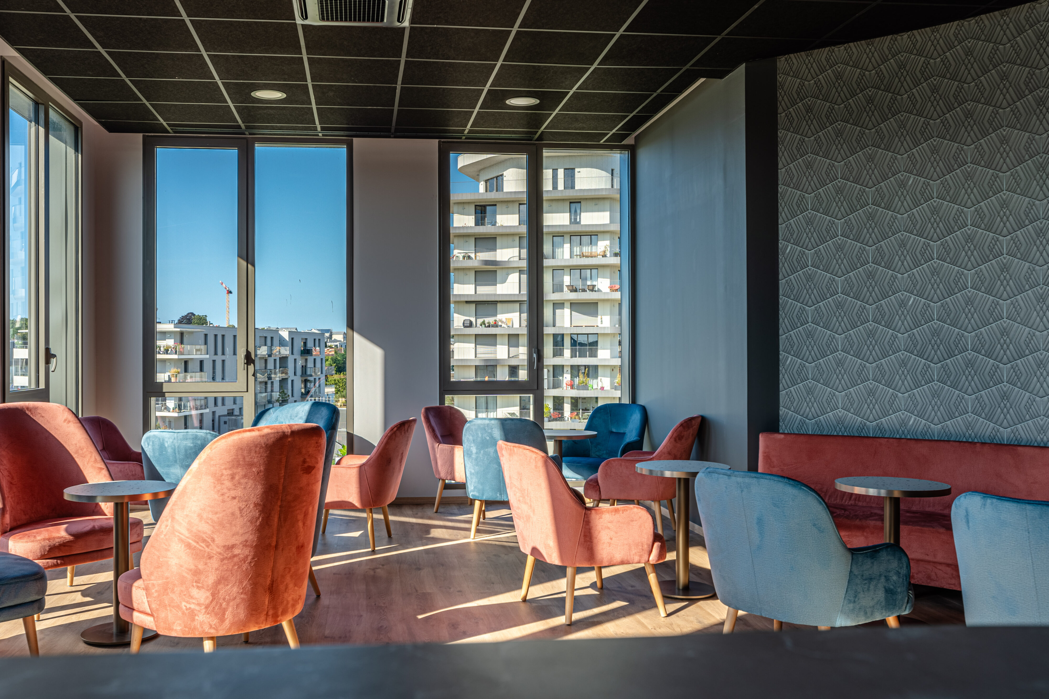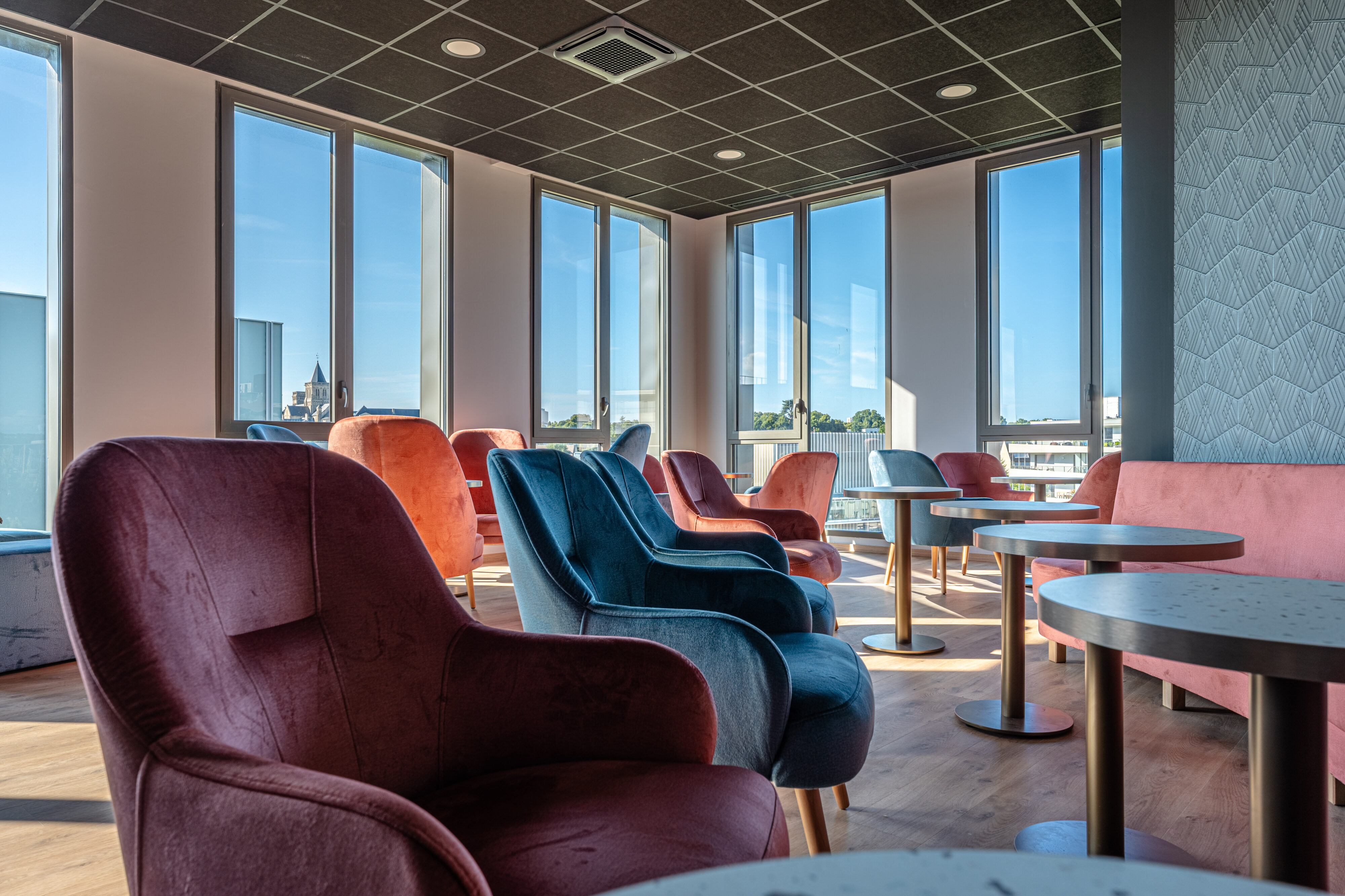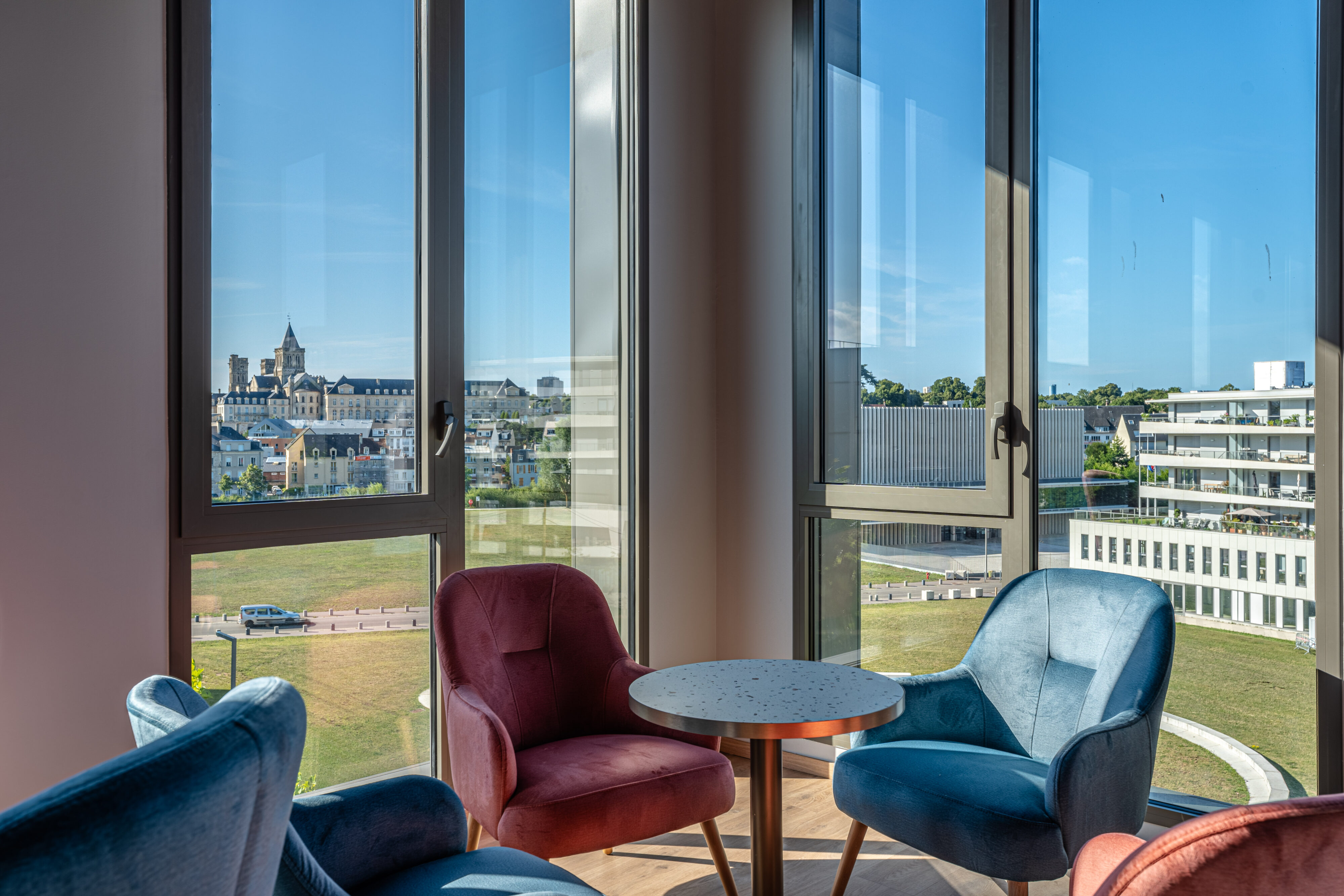 Face aux aléas du climat normand, vous pouvez opter pour le Bar lounge, un espace cosy et lumineux grâce à ses grandes baies vitrées permettant d’admirer l’Abbaye-aux-Dames, les jardins du Conseil Régional et l’Arbre de Mathilde.