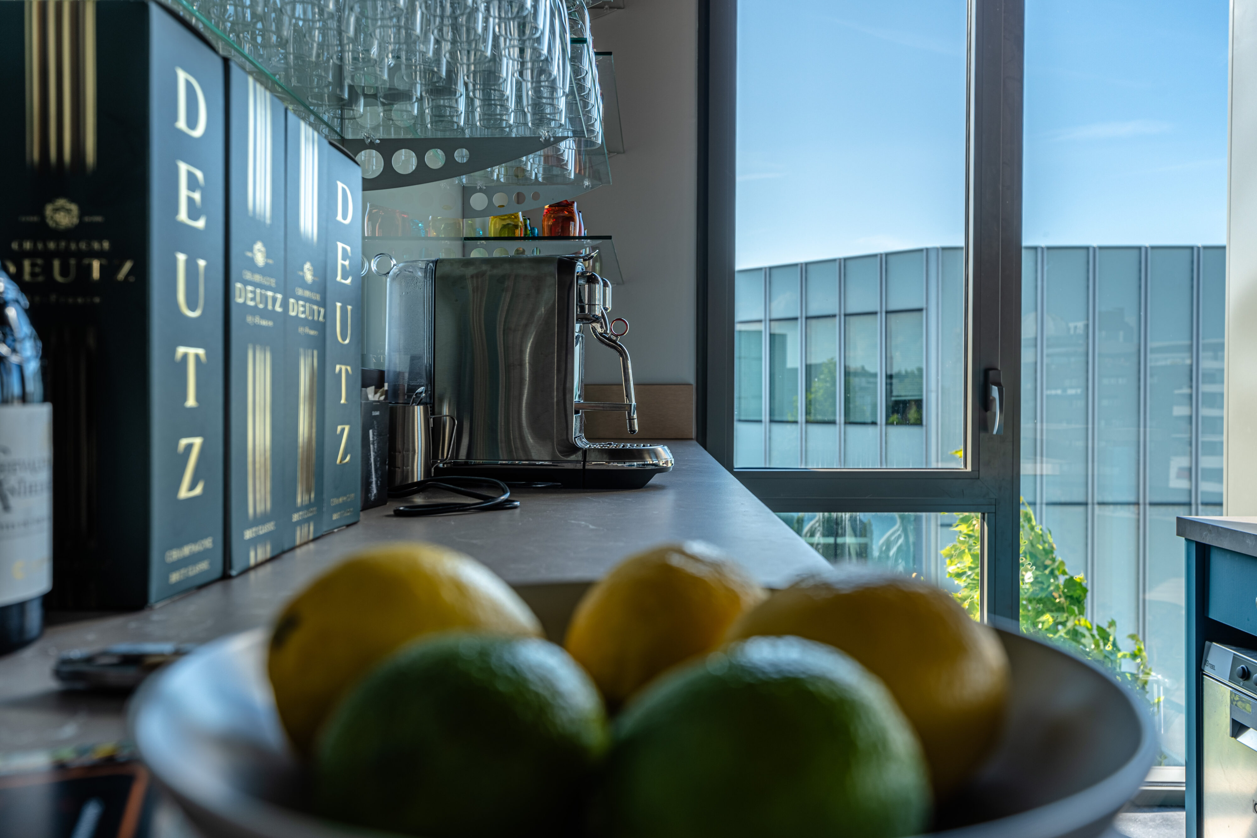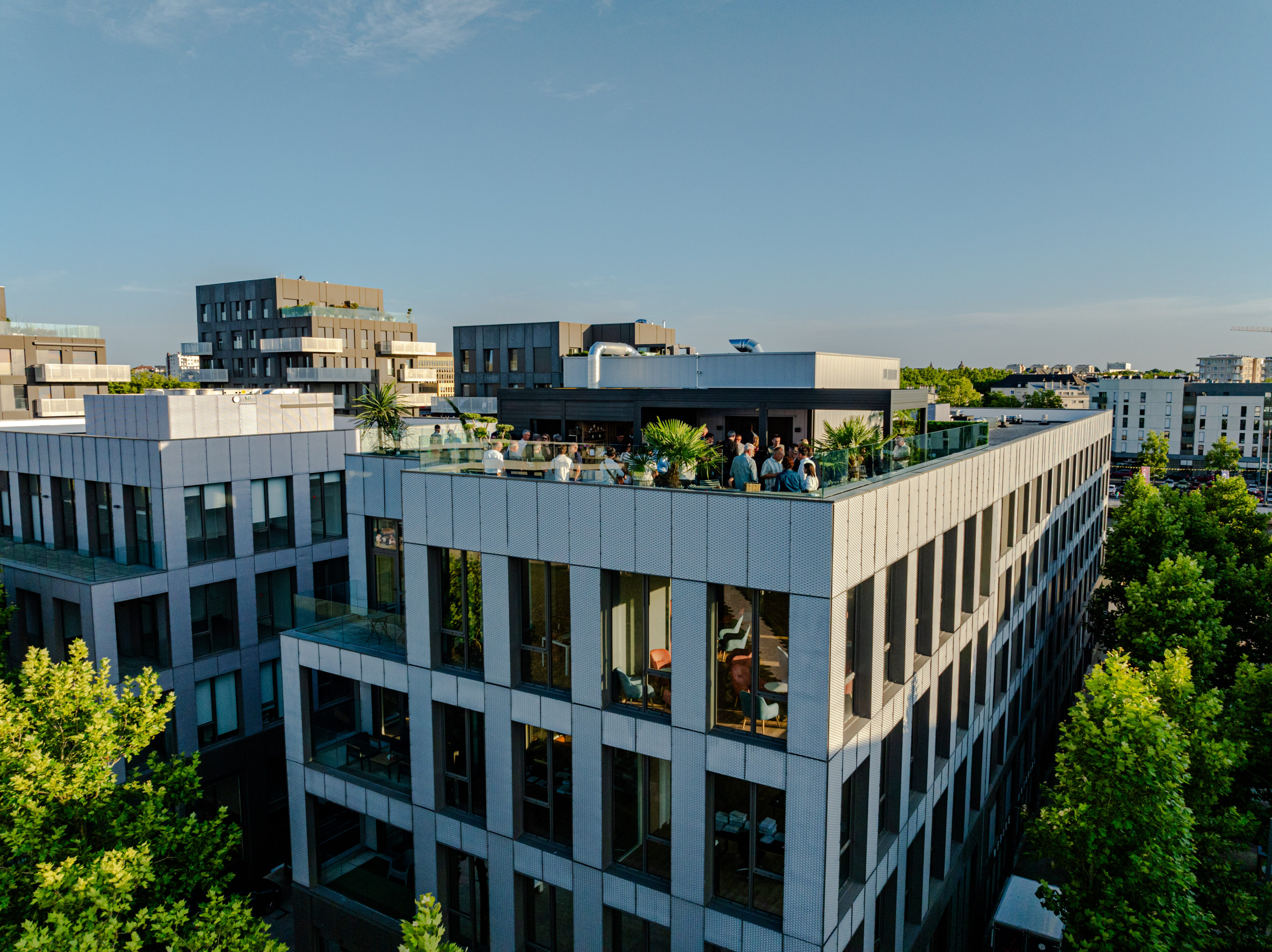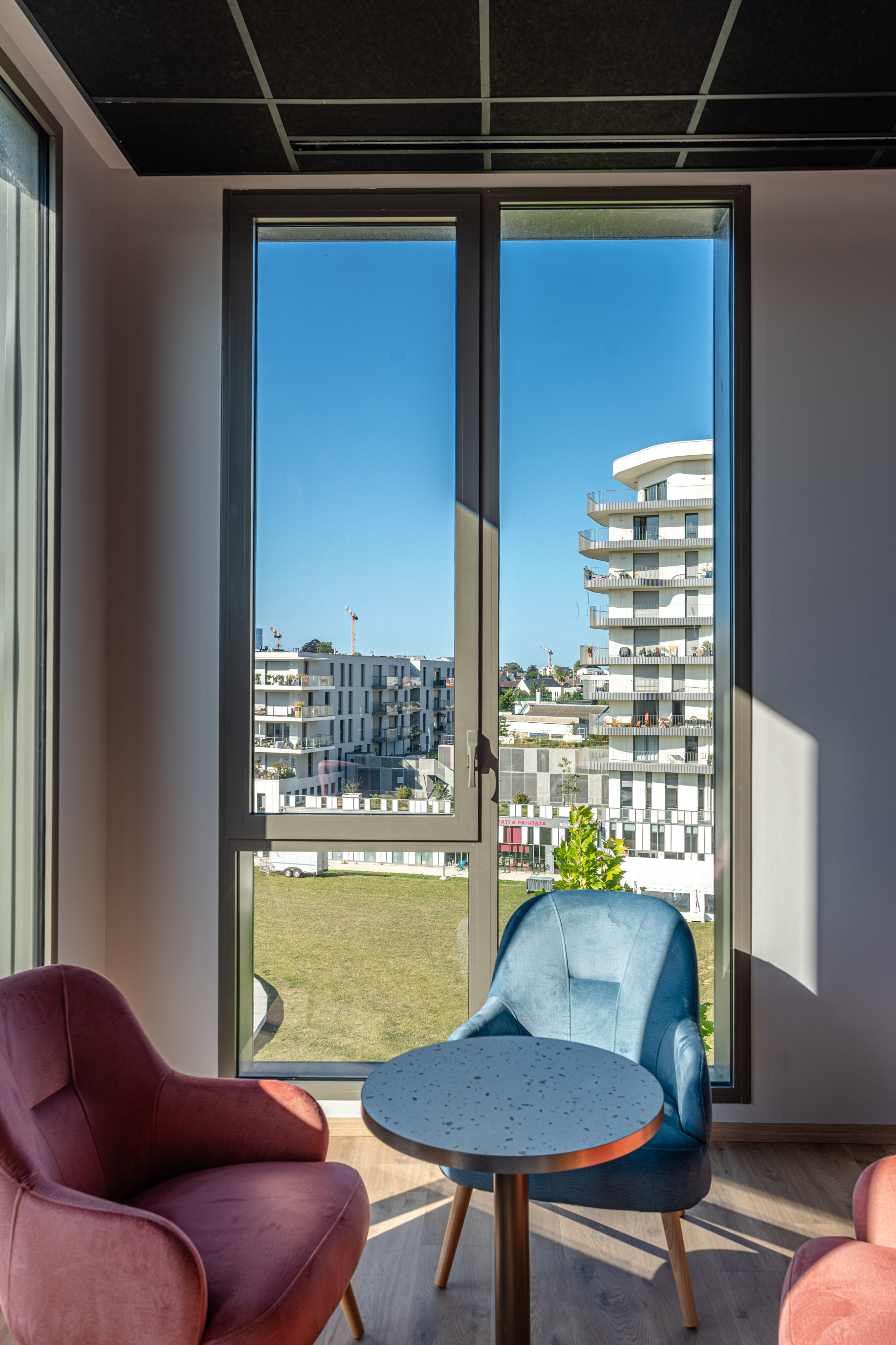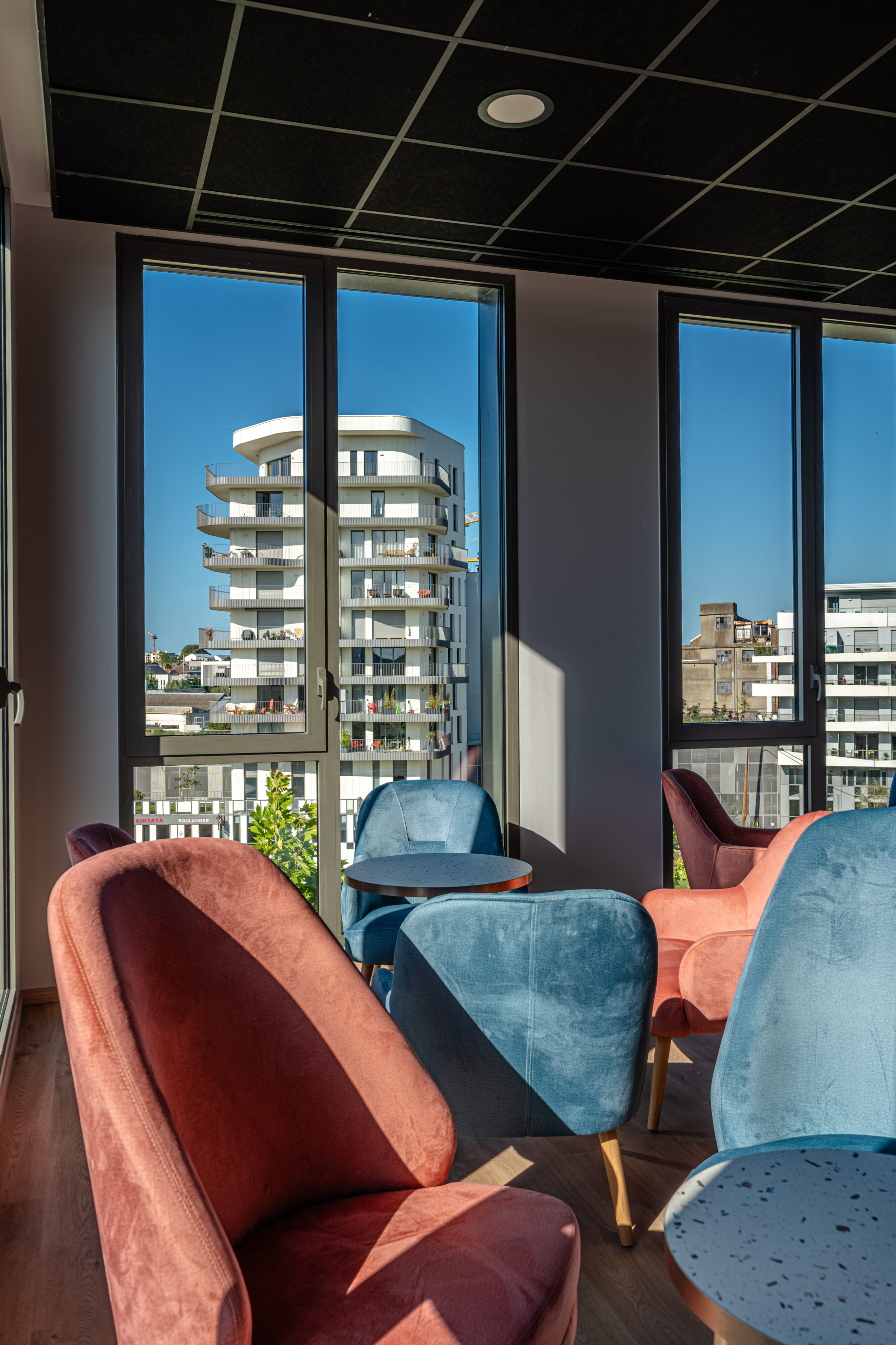 Face aux aléas du climat normand, vous pouvez opter pour le Bar lounge, un espace cosy et lumineux grâce à ses grandes baies vitrées permettant d’admirer l’Abbaye-aux-Dames, les jardins du Conseil Régional et l’Arbre de Mathilde.