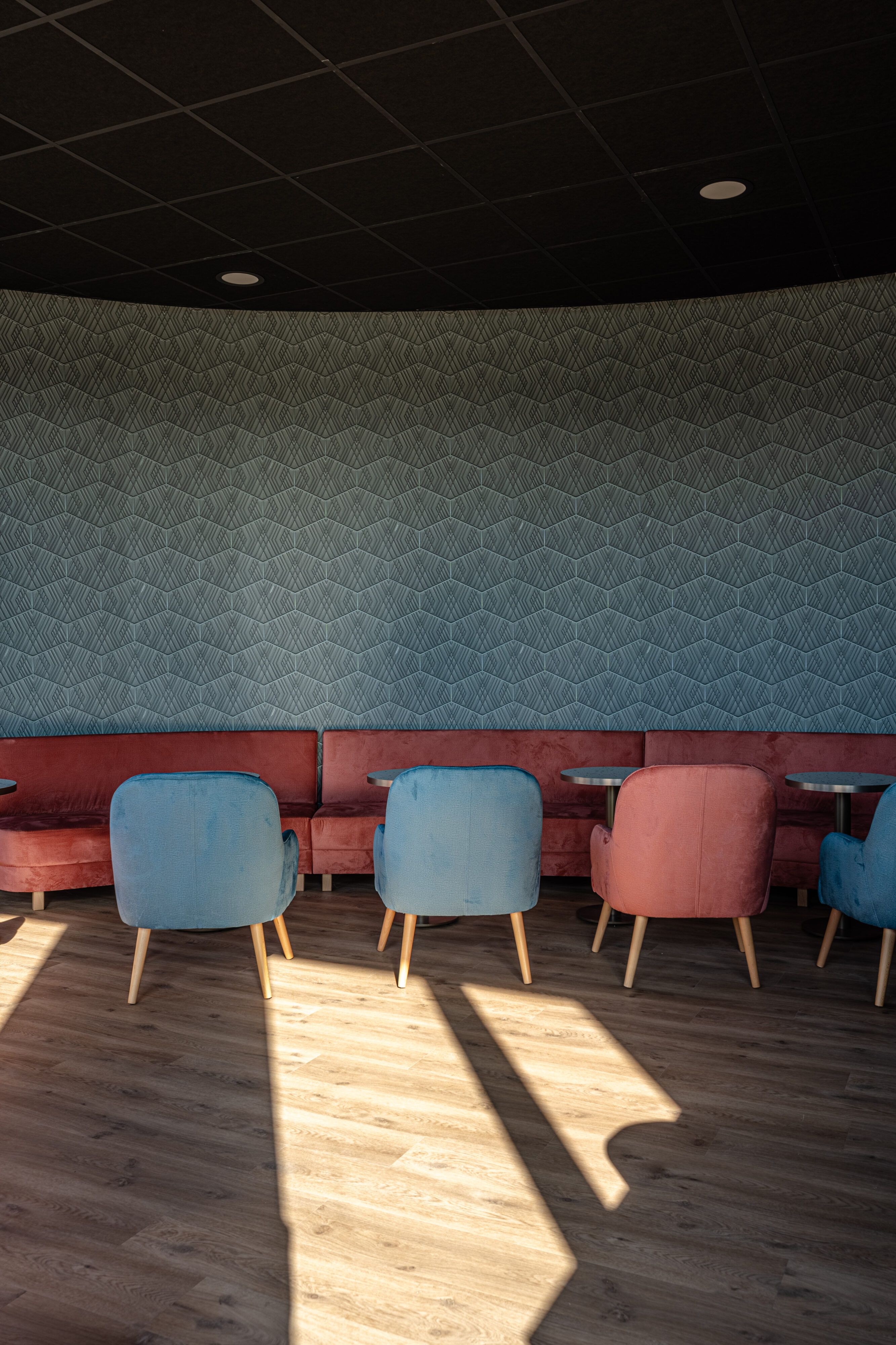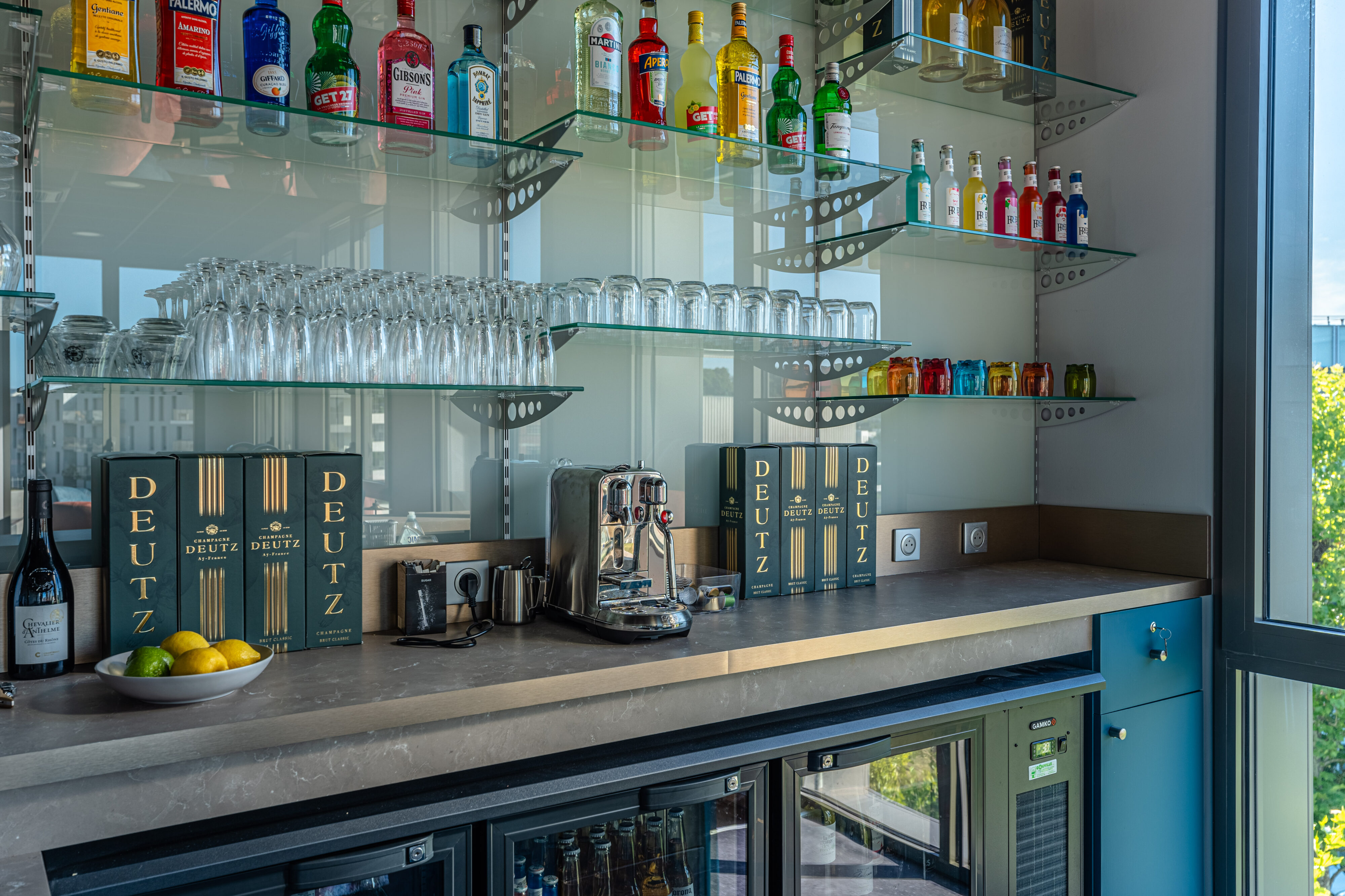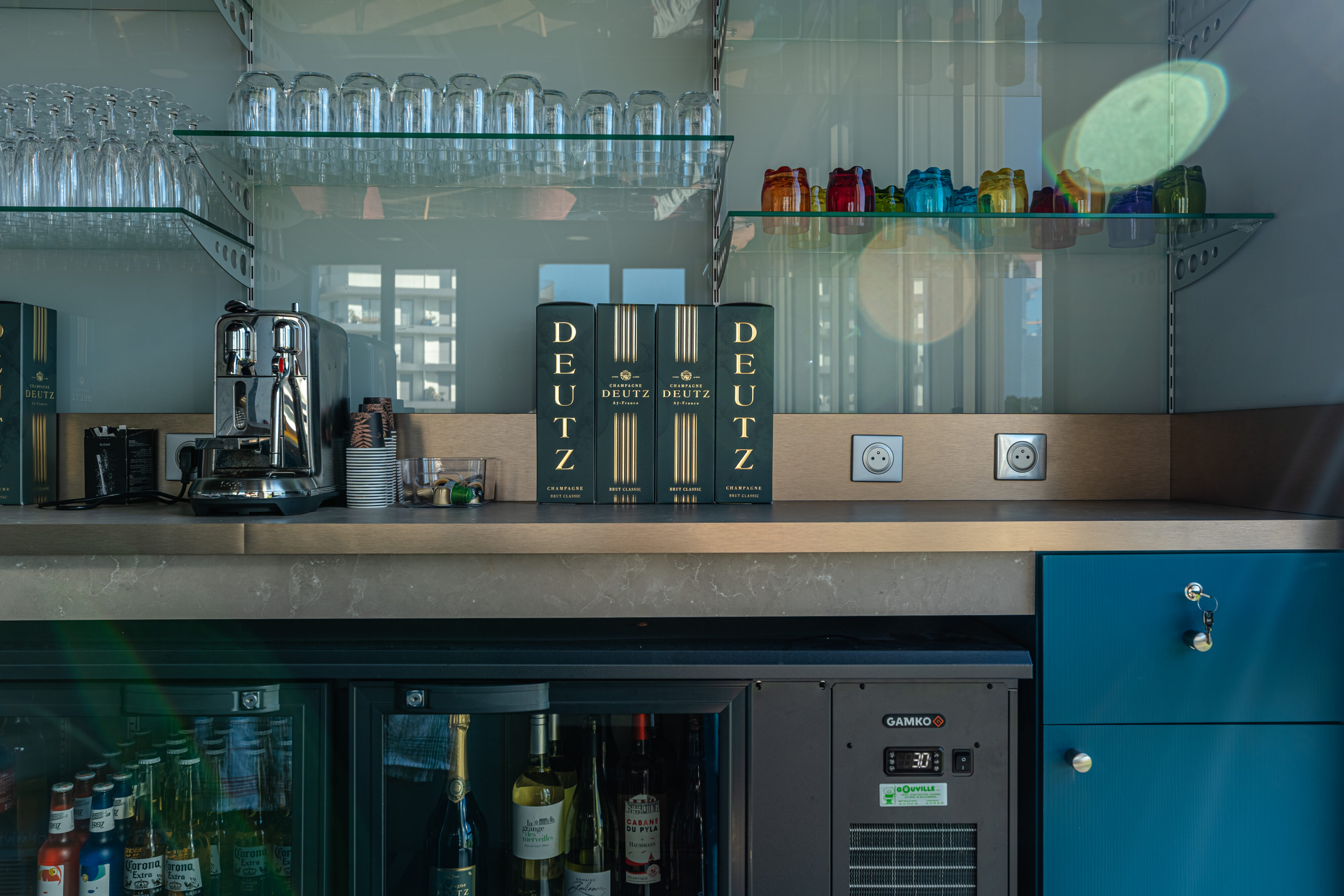 Le Bar lounge est équipé de matériels professionnels : machine à café, réfrigérateur, machine à glaçons, lave-verres et peut accueillir jusqu’à 35 personnes.